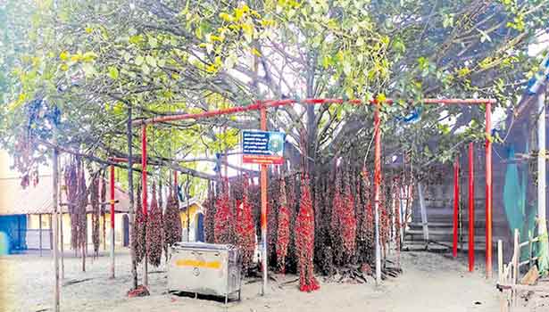 இதற்கிடையே கொடிமரத்தில் இருந்த மணி கீழே விழுந்ததால் அதற்கான பரிகார பூஜை செய்ய தேவப் பிரசன்னம் பார்க்கப்பட்டது. அப்போது, பக்தர்கள் தனக்கு மணிகளைக் காணிக்கையாக்கி இந்த ஆலமரத்தில் கட்டினால், தான் மிகவும் மகிழ்ச்சியடைவதாகத் தேவி தெரிவித்தாள். அதனைத் தொடர்ந்து, கோவிலில் இருக்கும் ஆலமரத்தில் மணிகளைக் கட்டும் வழிபாடு, முதன்மை வழிபாடாகி விட்டது என்கின்றனர்.