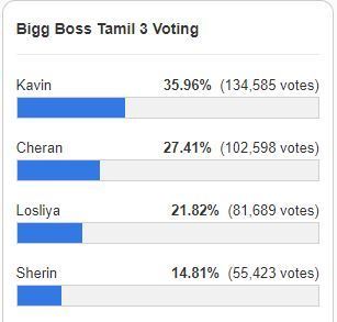 இந்நிலையில் நமக்கு கிடைத்துள்ள தகவலின் படி அதிகமான ஓட்டுகளுடன் கவின் முதலிடத்திலும் சேரன் இரண்டாம் இடத்திலும் இருப்பதாக கூறப்படுகிறது.