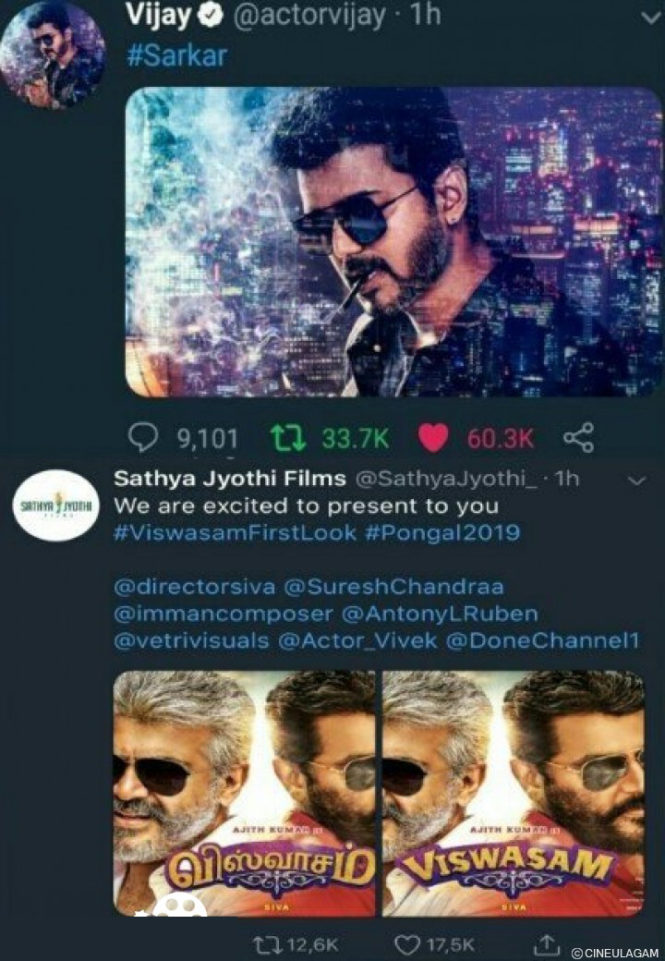 ஒரு மணி நேரத்தில் சர்கார் போஸ்டர் 33 ஆயிரம் ரீட்வீட்கள் மற்றும் 60 ஆயிரம் லைக்குகள் பெற்றது, ஆனால் விசுவாசம் போஸ்டருக்கு ஒரு மணி நேரத்தில் 12 ஆயிரம் ரீட்வீட் மற்றும் 17 ஆயிரம் லைக்குகள் மட்டுமே கிடைத்தது.