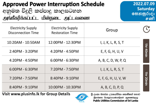 இதன்படி, A,B,C,D,E,F,G,H,I,J,K,L,P,Q,R,ST,U,V,W ஆகிய வலயங்களில், பகல் வேளைகளில் ஒரு மணித்தியாலமும் 40 நிமிடங்களும், இரவு வேளையில் ஒரு மணித்தியாலமும் 20 நிமிடங்களும் மின்வெட்டு மேற்கொள்ளப்படவுள்ளது.