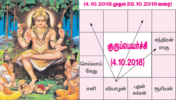 நவக்கிரகங்களில் சுபகிரகம் என்று வர்ணிக்கப்படுபவர் குரு பகவான். அந்த குருவருள் இருந்தால் தான் நமக்கு திருவருள் கிடைக்கும். அப்படிப்பட்ட குருவின் பார்வையை பெறும் 3 ராசிகள் ரிஷபம், கடகம், மீனம் ஆகிய ராசிகளாகும். ஜென்ம ராசியில் சஞ்சரித்தாலும் தன பஞ்சமாதிபதியாக விளங்கும் குரு பகவான் தன வரவை அதிகரிக்க வைக்கும் ராசியாக விருச்சிக ராசி விளங்குகின்றது. எனவே மேற்கண்ட 4 ராசிக் காரர்களுக்கும் தொட்டது துலங்கும், தொகை வரவு உயரும். பொன்னும், பொருளும் போற்றுகிற செல்வாக்கும் இன்னும்பெருகி இயல்பான வளம் கிடைக்கும்.