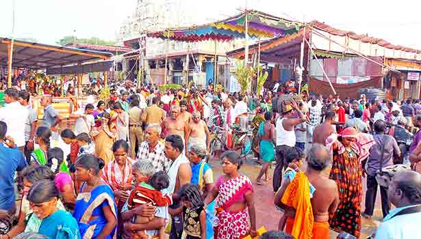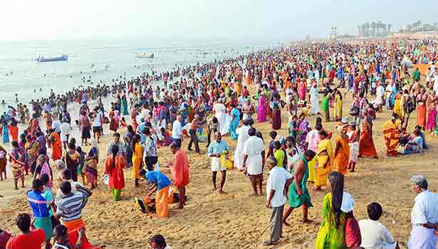 கடலில் புனித நீராட கடற்கரையில் திரண்ட பக்தர்கள் கூட்டத்தை படத்தில் காணலாம்.