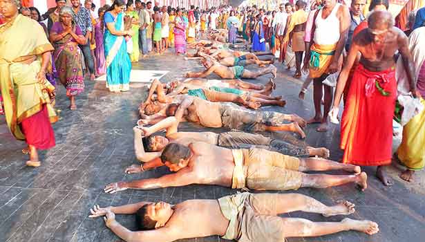 கோவில் கிரிபிரகாரத்தில் அங்கப்பிரதட்சணம் செய்யும் பக்தர்கள்.