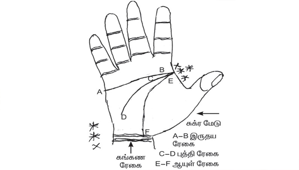 ஆயுள் ரேகை: ஆயுள் ரேகை கட்டை விரலுக்கு மேல் உள்ளங்கையின் விளிம்பில் துவங்கி, மணிக்கட்டை நோக்கி ஒரு வில் போல அமைந்திருக்கும். இது ஒருவருடைய உடல் ஆரோக்கியம், பேரழிவு நிகழ்வுகள் மற்றும் இடமாற்றங்கள் குறித்து கூறுகிறது.- Source: .webdunia