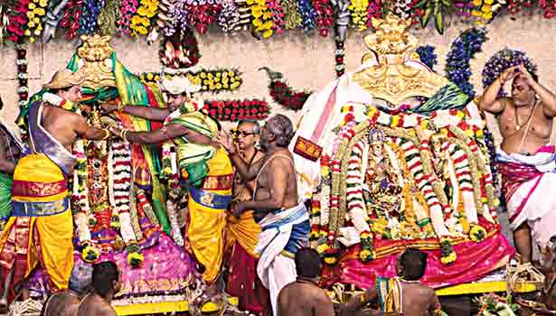 அப்போது பக்தர்கள் சுந்தரேசுவரா… மீனாட்சி அம்மன் என்று முழங்கினர். மேடையின் மேல் புறத்தில் இருந்து மலர்கள் அம்மன்-சுவாமி மீது தூவப்பட்டது.